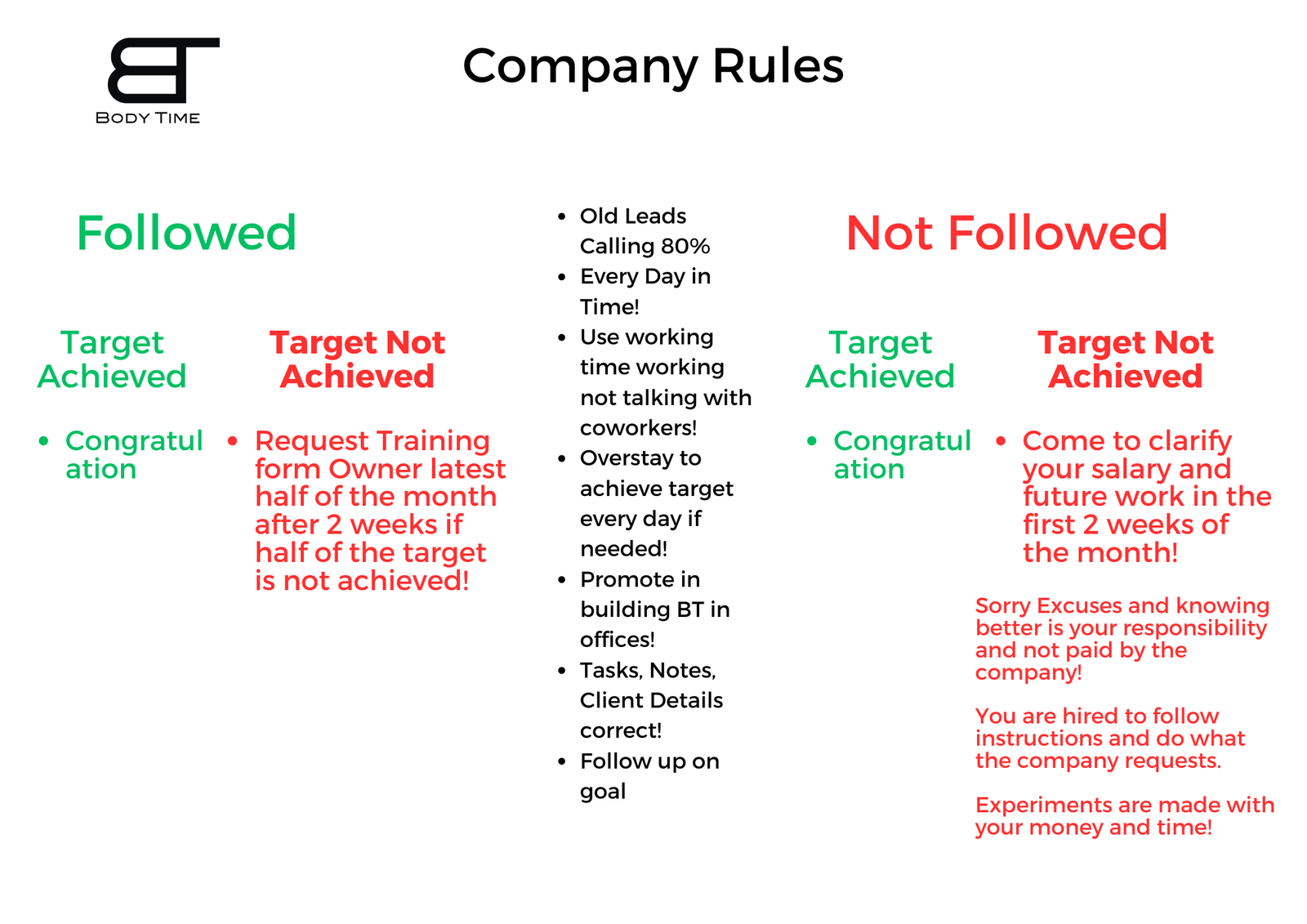 10. Regularly follow up and review, and refresh your knowledge on our Knowledge Base page. Here, you will find information about our meetings, sales training, product knowledge, and how to use the system. Here is the link: https://bodytime.ae/team-meetings/